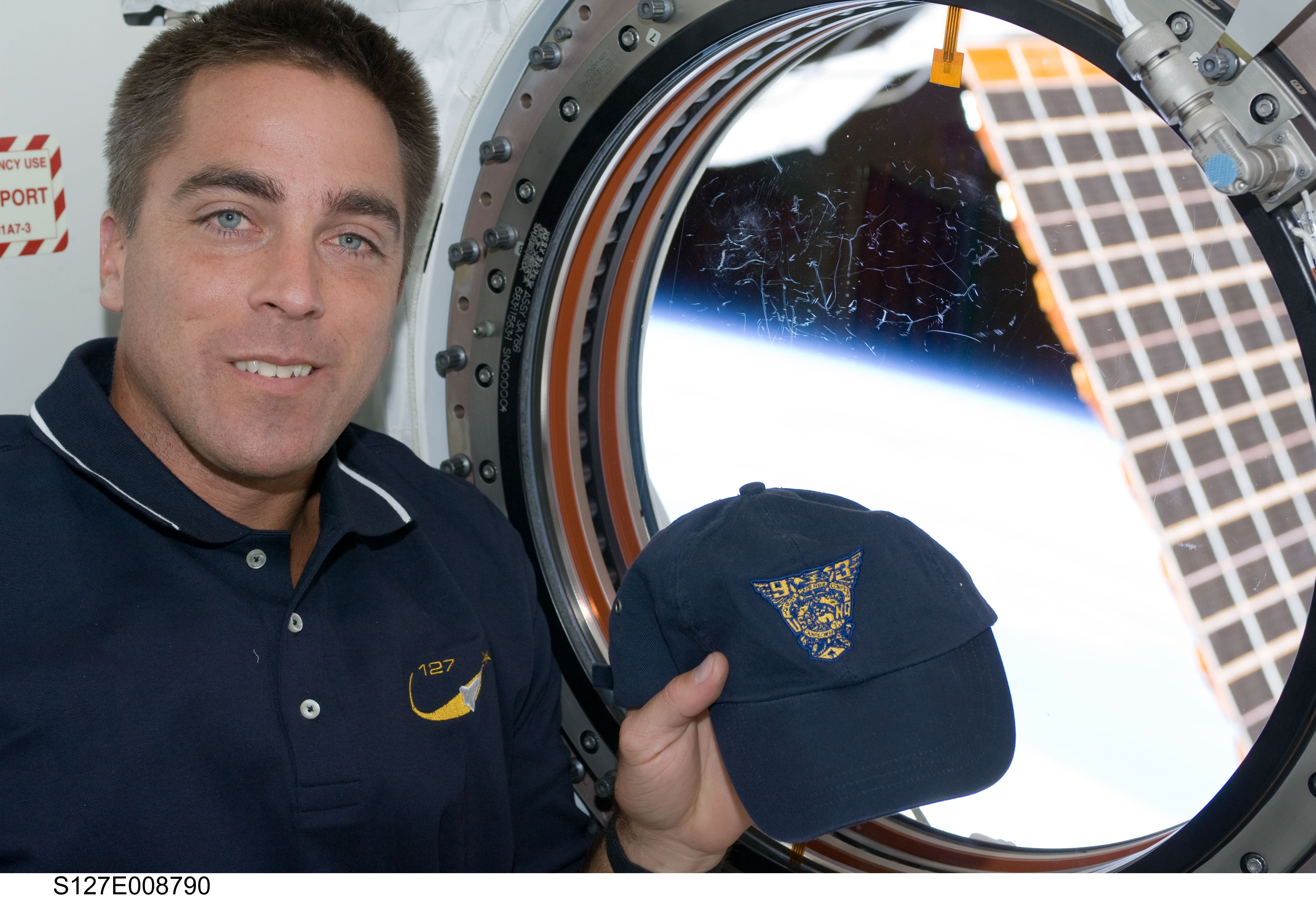 Chris Cassidy, displaying his USNA 1993 ball cap, aboard the ISS looking out the aft JEM window during STS-127.