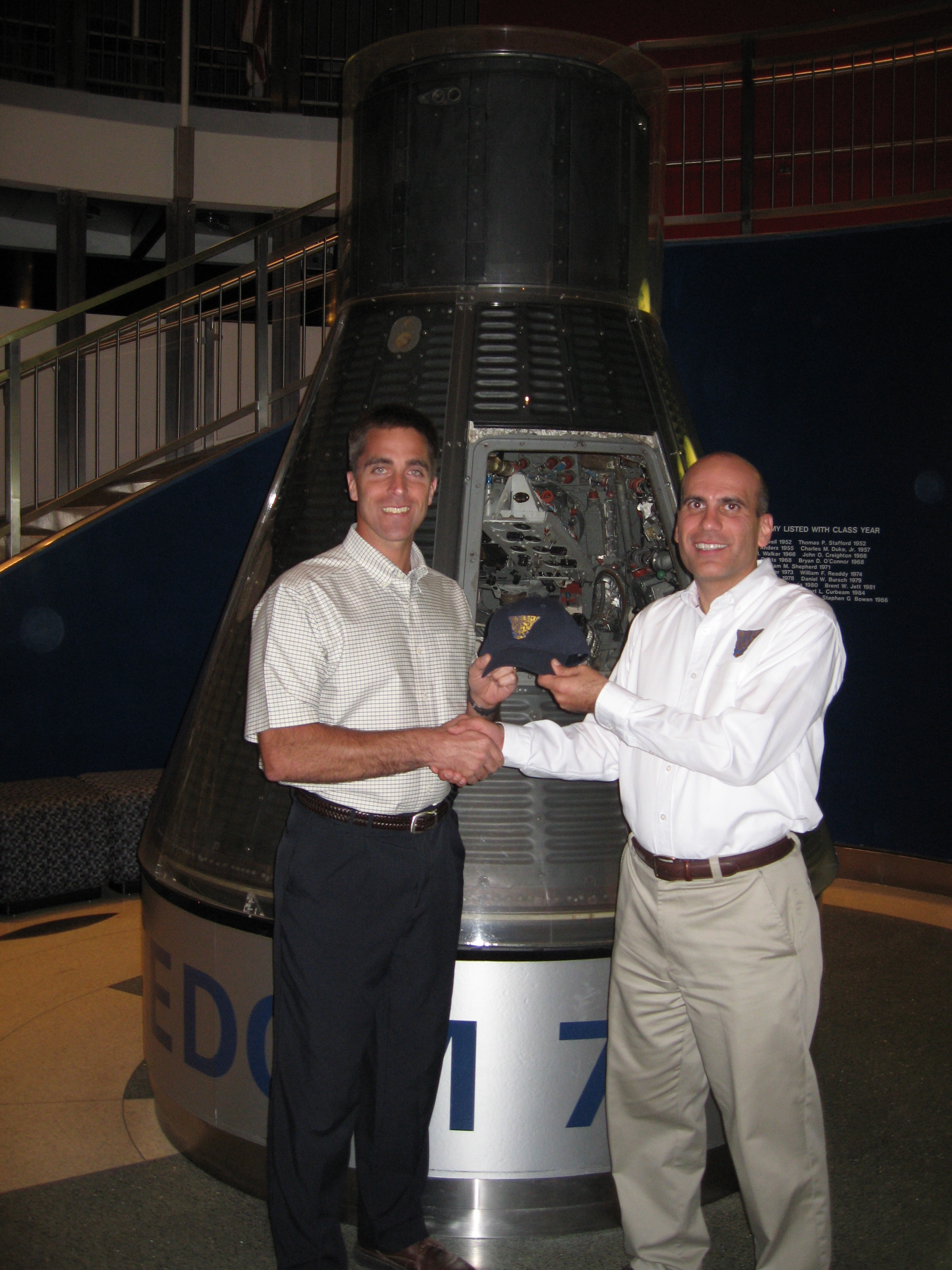 Presenting Chris Cassidy with a USNA '93 ball cap to bring into space aboard the space shuttle Endeavour (STS-127)